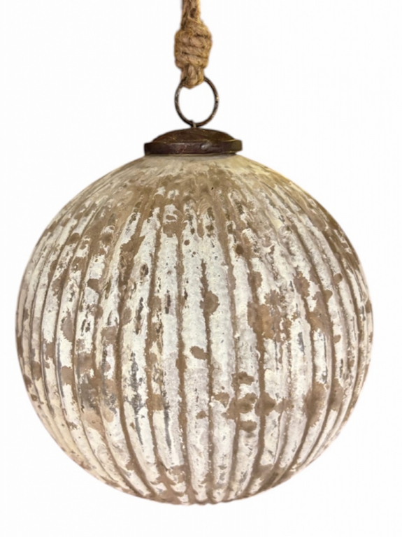 Veľká sklenená vianočná guľa XXL s hnedastobielou patinou a jemným reliéfnym povrchom je pôsobivým doplnkom pre prirodzenú a útulnú vianočnú výzdobu. Kovový úchyt v tmavom odtieni dopĺňa jutový špagát, ktorý podčiarkuje jej rustikálny a vintage charakter. Patinovaný povrch vytvára autentický dojem starého skla – elegantný, ale zároveň nenútený.