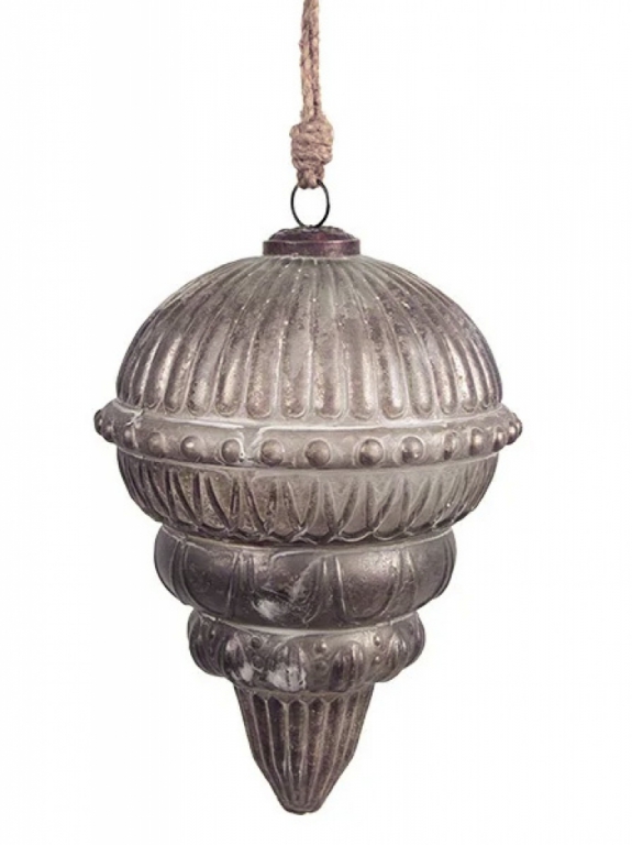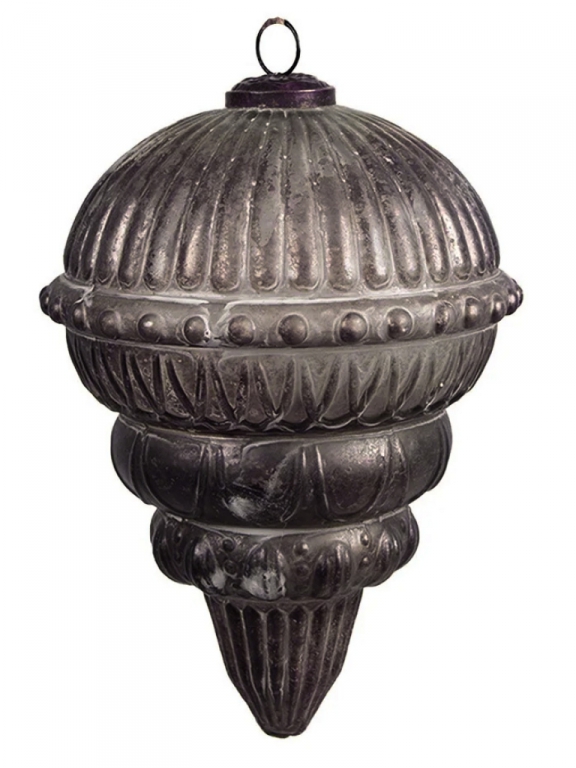 Veľká elegantná XXL sklenená vianočná guľa v netradičnom tvare s reliéfnym zdobením a efektom kaleného sivého skla pôsobí výrazne a štýlovo. Vďaka kombinácii tmavosivého tónu, jemnej patiny a kovového úchytu má dekorácia jedinečný vintage charakter. Povrch s drobnými nepravidelnosťami dodáva guli autentický vzhľad ručne spracovaného skla.