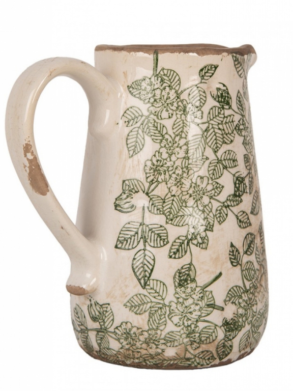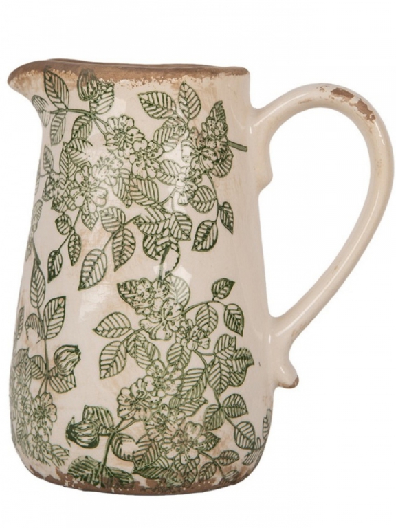 Štýlový dekoratívny džbán Clayre & Eef s jemným zeleným kvetinovým vzorom na béžovom podklade vnesie do interiéru pokojný, vidiecky nádych. Džbán je určený na dekoratívne účely – môžete ho použiť ako vázu na sušené kvety alebo ako samostatný dizajnový prvok na stole, polici či komode.