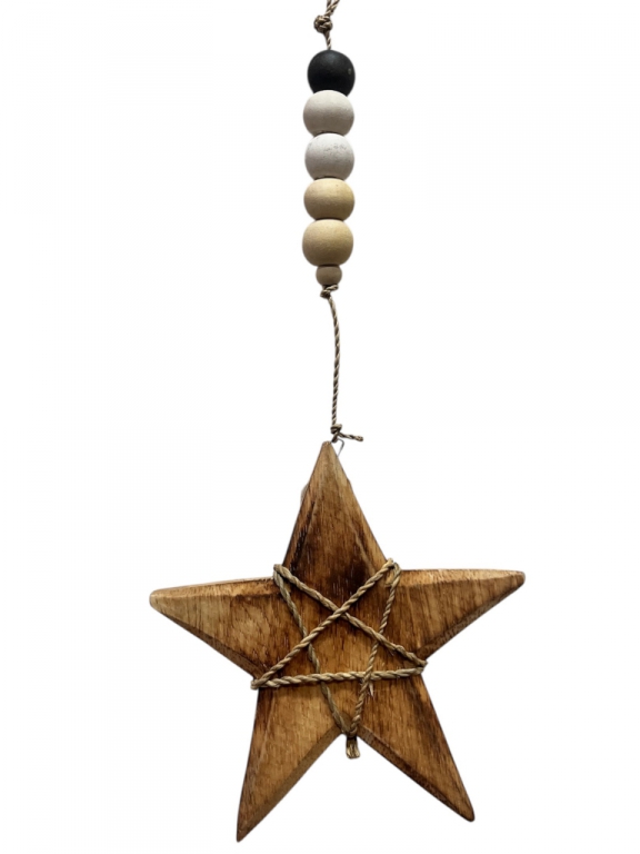 Jemne patinovaná drevená hviezda z ľahkého dreva pôsobí prirodzene a elegantne. Visí na šnúrke z morskej trávy, ktorá je ozdobená drevenými guľôčkami v prírodných tónoch. Krásny doplnok vianočného stromčeka, venca či zimného aranžmánu.