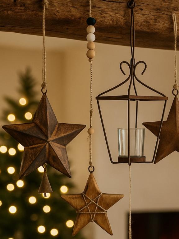 Hviezda je zavesená na jutovom povrázku, takže ju môžete ľahko umiestniť na stenu, dvere, trám alebo vianočný stromček. Kombinácia dreva, kovu a juty pôsobí harmonicky a prirodzene – ideálny doplnok do vidieckych, boho aj severských interiérov.