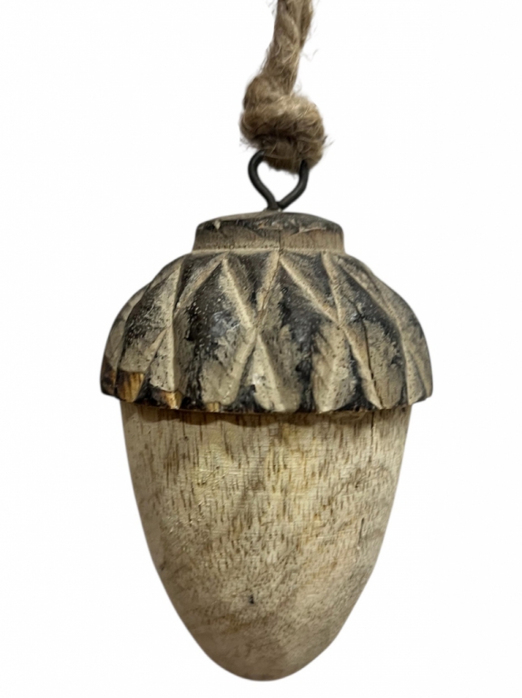 Jednoduchosť, ktorá má dušu. Táto drevená vianočná guľa v tvare žaluďa je ručne vyrobená z mangového dreva v čisto prírodnom prevedení – bez efektov a zdobenia. Každý kus je originál, s jedinečnou kresbou dreva, ktorá podčiarkuje jeho autentickosť.