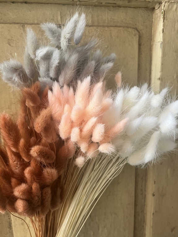 Jemné sušené chvostíky Lagurus ovatus v štýlovom mixe štyroch farieb – sivá, púdrová ružová, snehobiela a jemná hnedá – patria medzi najobľúbenejšie dekoratívne trávy. Ich hebké klasy pôsobia ľahko a elegantne, pričom dodajú priestoru hrejivý a prirodzený vzhľad.
