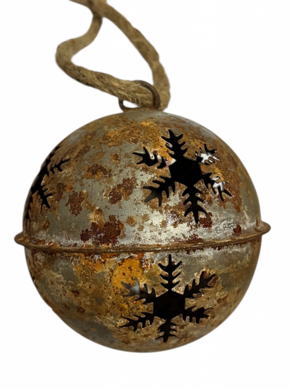 Veľká kovová rolnička s priemerom 9 cm v nádhernom korténovom – hrdzavom efekte je výraznou dekoráciou, ktorá okamžite navodí vianočnú atmosféru. Povrch s jemnou patinou a výrezmi s motívom vločiek pôsobí autenticky a rustikálne, zatiaľ čo hrubý jutový povrázok dotvára jej prírodný charakter.