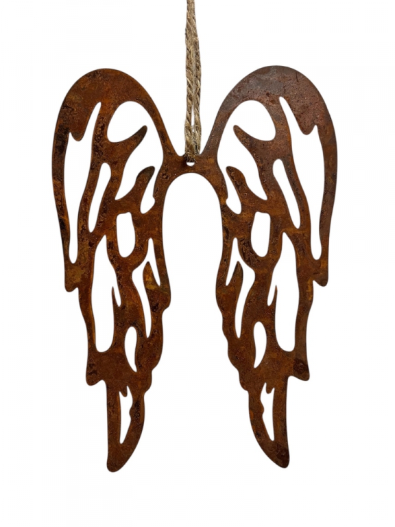 Tieto ploché kovové krídla s autentickým korténovým – hrdzavým efektom dodajú priestoru jemný dotyk elegancie a rustikálneho čara. Ich jedinečný dizajn vynikne samostatne, ale aj ako doplnok na veniec, vianočný stromček alebo zavesené na dreve či tráme v kombinácii so sklenenými guľami a prírodnými materiálmi.