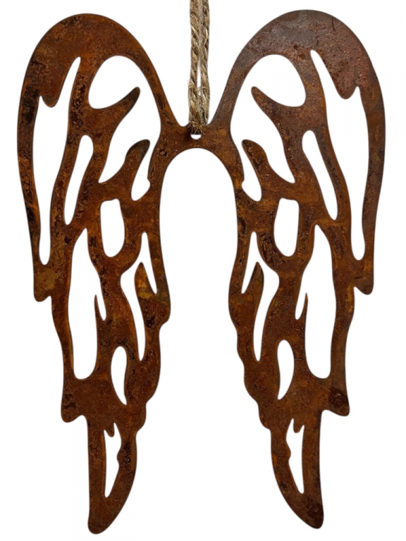 Tieto ploché kovové krídla s autentickým korténovým – hrdzavým efektom dodajú priestoru jemný dotyk elegancie a rustikálneho čara. Ich jedinečný dizajn vynikne samostatne, ale aj ako doplnok na veniec, vianočný stromček alebo zavesené na dreve či tráme v kombinácii so sklenenými guľami a prírodnými materiálmi.
