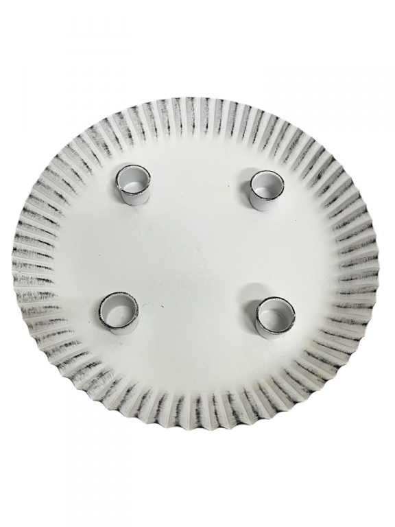 Krásny kovový adventný svietnik v bielej vintage úprave pôsobí jemne a romanticky. Je určený pre kónické sviečky a vďaka svojmu dizajnu s jemným vrúbkovaním po okrajoch sa stane výrazným, no stále decentným doplnkom vianočného interiéru.