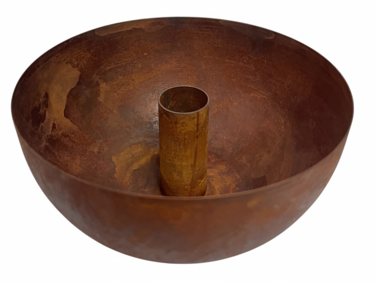 Originálny kovový svietnik v tvare misky so stredovým držiakom na kónickú sviečku je krásnym doplnkom pre tých, ktorí majú radi teplý rustikálny štýl. Povrch s autentickým korténovým, hrdzavým efektom pôsobí prirodzene a elegantne – ako drobný detail s nádychom histórie.