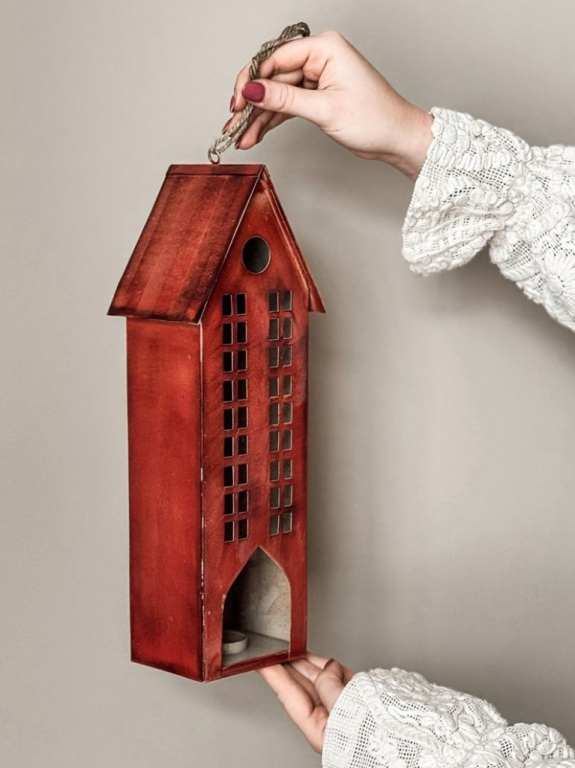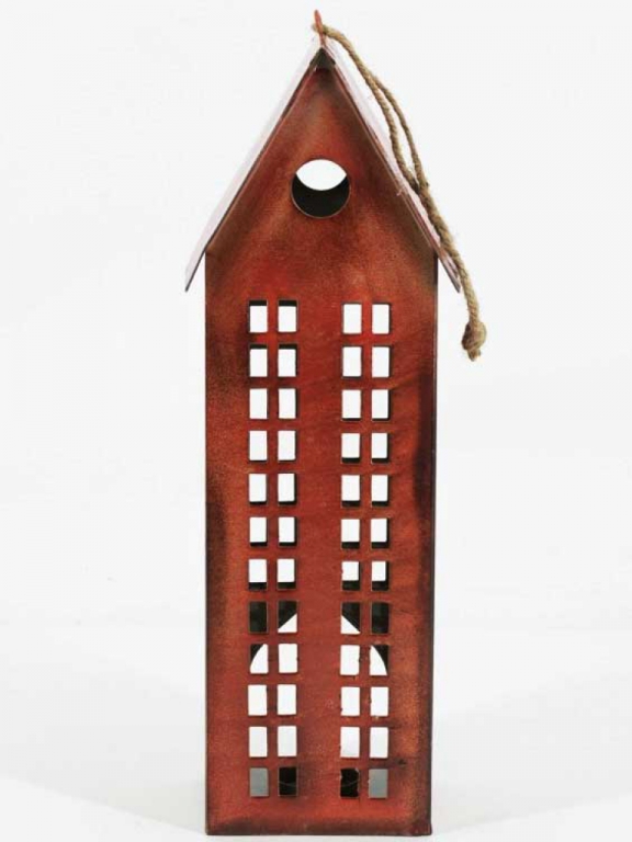 Vysoký kovový svietnik v tvare domčeka v zaujímavej červeno-hnedej farbe s tmavšou patinou dodá interiéru aj exteriéru útulnú atmosféru a industriálny nádych. Svetlo zo sviečky preniká cez množstvo drobných okienok a vytvára pôsobivý svetelný efekt, ktorý vynikne najmä vo večerných hodinách.