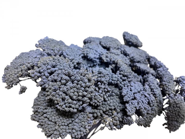 Sušený rebríček (Achillea) v modernom modrom odtieni je výrazným dekoračným prvkom, ktorý okamžite prinesie aranžmánu textúru a bohatosť. Jeho typické zoskupené kvety vytvárajú husté, zaoblené hlavičky, ktoré v kompozíciách pôsobia plno, stabilne a veľmi esteticky.