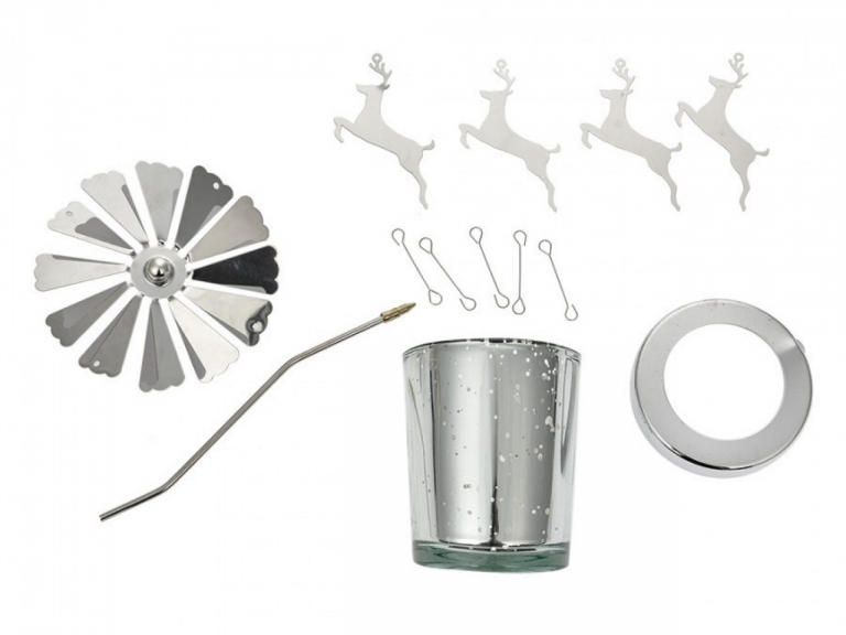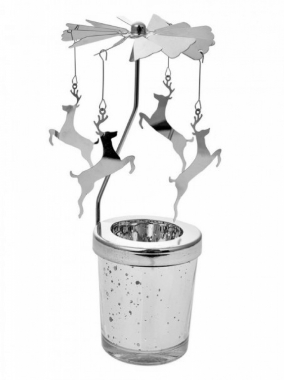 Elegantný točiaci svietnik s jeleňmi v striebornom prevedení vytvára jedinečnú atmosféru plnú svetla a pohybu. Po zapálení čajovej sviečky sa jemné kovové jeleňe začnú otáčať, pričom odlesky svetla tancujú po stenách a navodzujú pokoj a sviatočnú náladu.