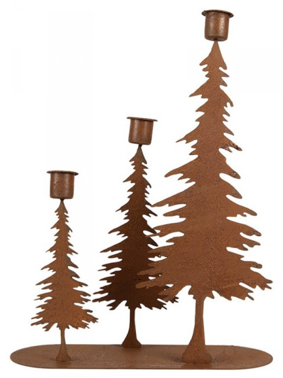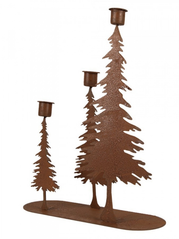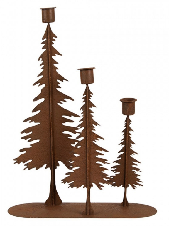 Dekoratívny kovový svietnik s hrdzavým efektom v tvare troch stromčekov vytvára jedinečnú zimnú a vianočnú atmosféru. Hrdzavý povrch pôsobí prirodzene a teplo – dokonale sa hodí do prírodného, rustikálneho alebo industriálneho interiéru.