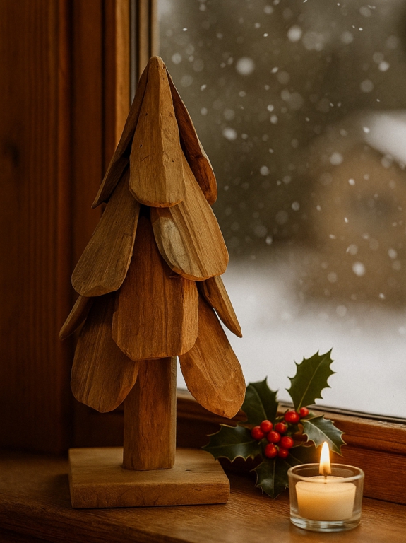 Ručne robený vianočný stromček z masívneho teakového dreva je jedinečným kúskom, ktorý prinesie do interiéru prirodzené teplo a útulnosť. Každý stromček má svoj vlastný tvar a štruktúru dreva – vďaka tomu pôsobí autenticky a originálne.