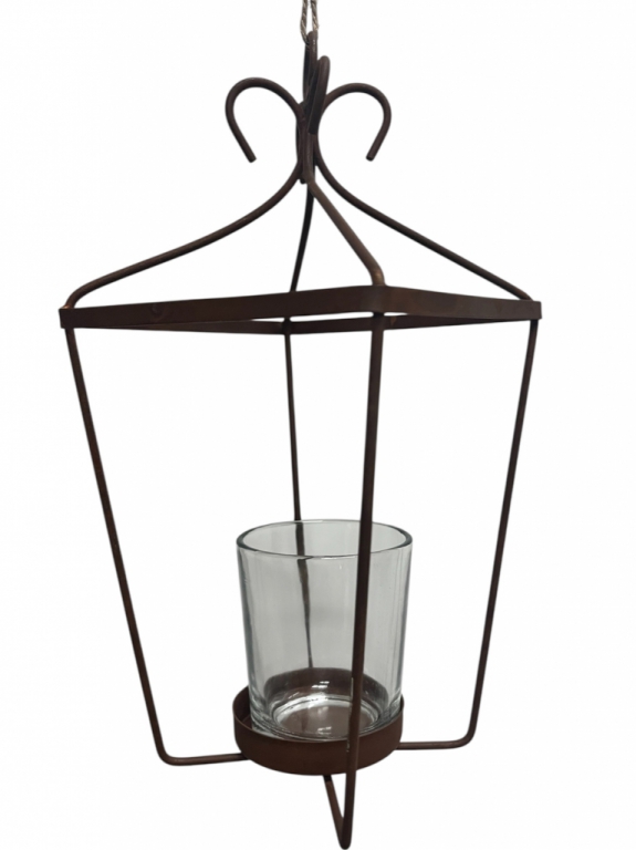 Elegantný závesný lampáš s minimalistickou kovovou konštrukciou a sklom na čajovú sviečku v sebe spája rustikálny šarm a jemnú jednoduchosť. Povrch v korténovom, hrdzavom efekte pôsobí autenticky a prirodzene – ideálny doplnok pre tých, ktorí milujú teplú atmosféru starých chalúp či vidiecky štýl.